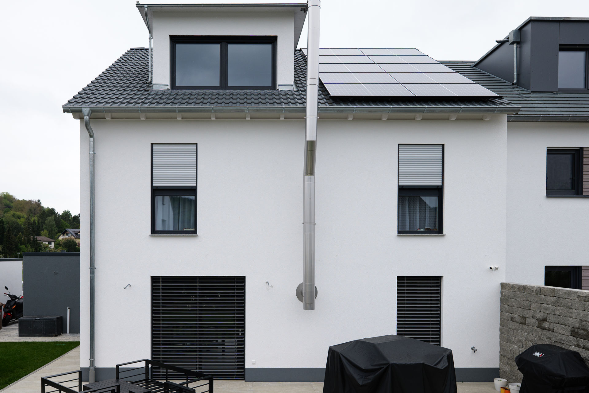 Da es sich um eine Doppelhaushälfte handelt, wurde der Baukörper bewusst versetzt gestaltet, um eine lebendigere Fassadenwirkung zu erzielen. Eine Überdachung, in Flucht mit der Garage, bildet dabei einen interessanten und zugleich wettergeschützten Übergangsbereich zwischen Garage und Haus.