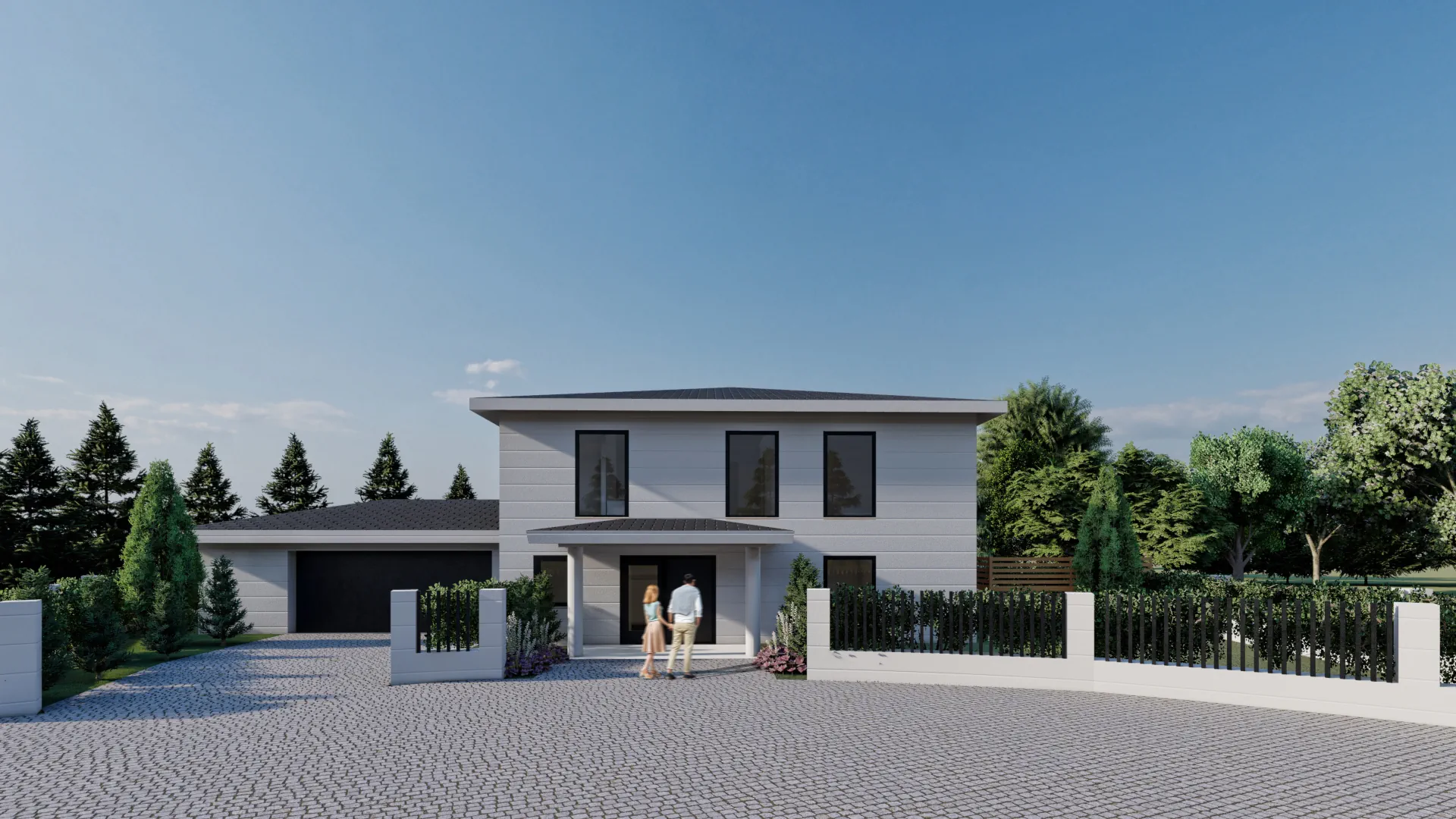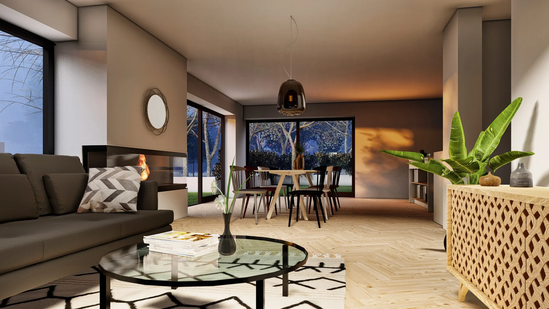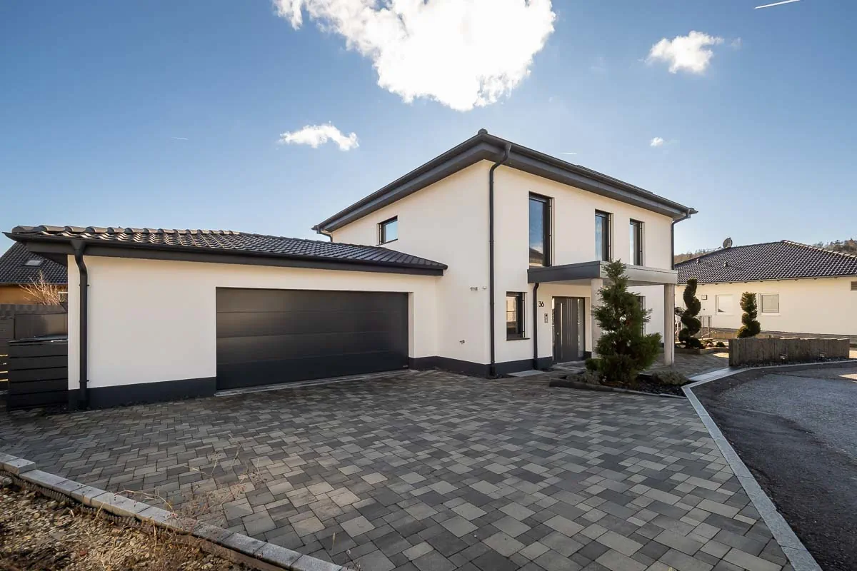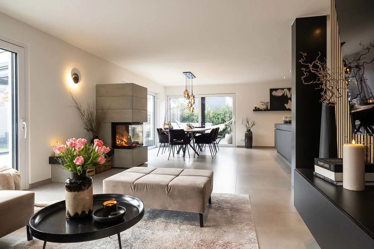 Dieses Wohnhaus überzeugt durch klare Architektur und eine hochwertige, zeitlose Gestaltung. Der offene Wohn- und Essbereich mit Kamin bildet das Herz des Hauses und wird durch einen Wintergarten mit zusätzlichem Kamin erweitert. Im Erdgeschoss ergänzen ein Arbeitszimmer und der direkte Zugang zur Doppelgarage das Raumprogramm.